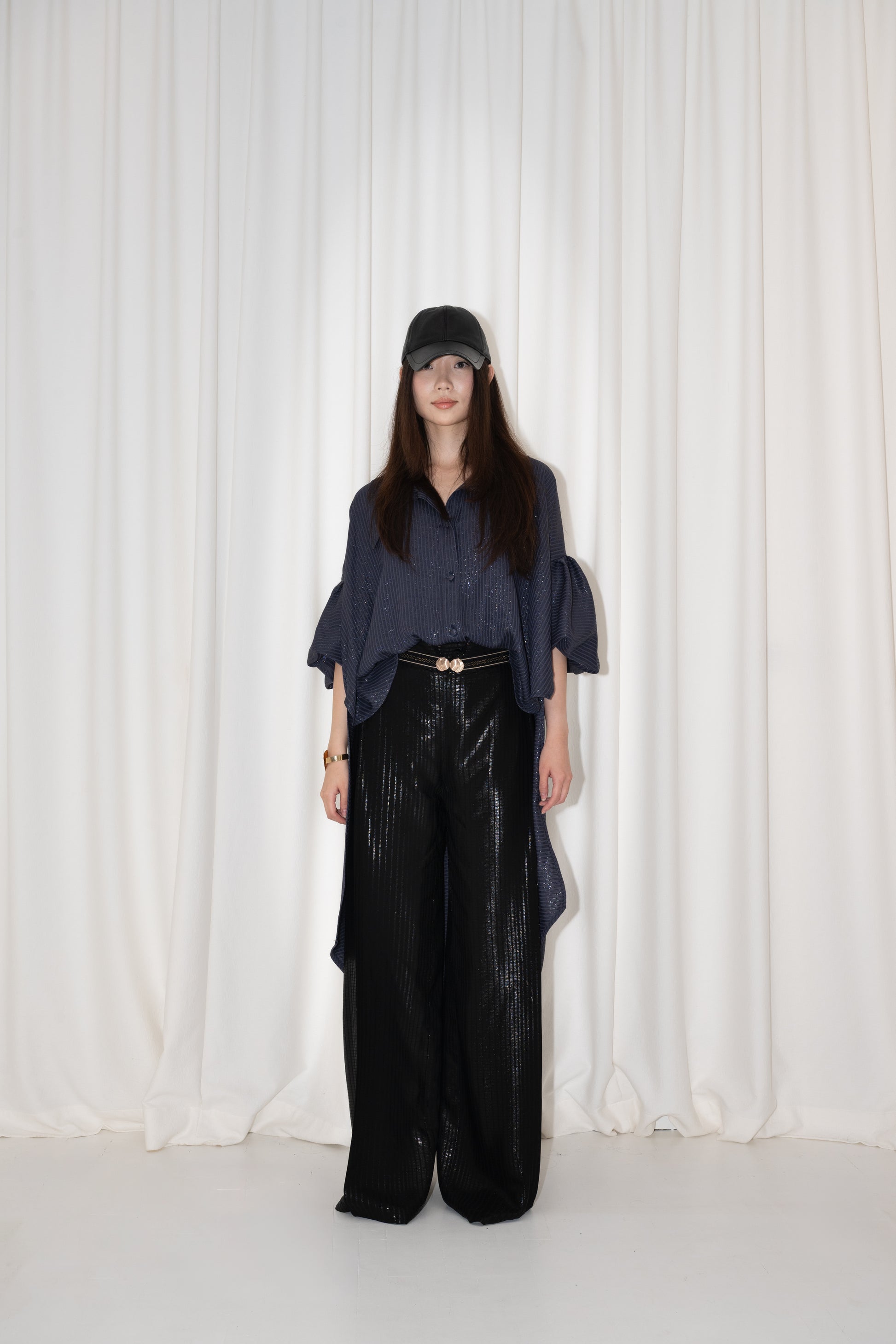 Cette chemise en soie possède des manches ballons avec une poignée élastique pratique pour la porter en manches longues ou courtes. Son col oversize revisite notre chemise signature pour un look élégant. Le pantalon large en soie à rayures satinées et mates est livré avec des poches plaquées et des plis de chaque côté, disponible dans toutes les tailles.